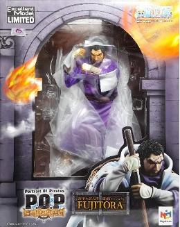 Debajo de ambos blisters encontraremos una base con un terminado de pintura metálica color malva, la cual tiene grabada la línea de la figura y nombre del personaje. Una vez colocado en su base, Fujitora alcanza los 24 cm de altura.