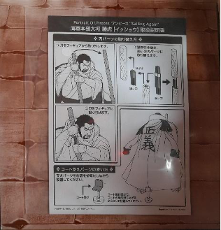 Al fondo del empaque podrás encontrar un pequeño instructivo. El cual nos indica que, gracias a un pequeño accesorio. La katana de Fujitora puede ser exhibida parcial o completamente envainada. También podremos ver un pequeño accesorio transparente que sirve para soportar el peso del abrigo de la Marina.